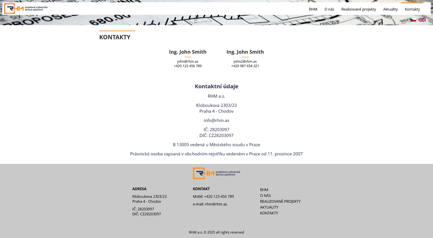 Web pro RHM a.s., projektovou a inženýrskou společnost. Jedná se o dvoujazyčné informativní stránky. Mezi funkcionality patří samozřejmosti, jako plně fungující responzivita nebo redakční systém na míru.