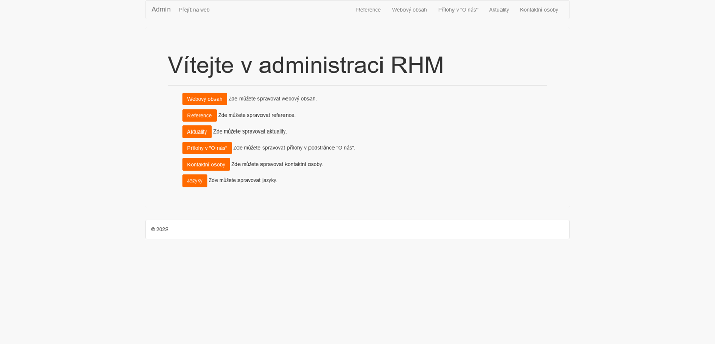 Jednoduchý a vícejazyčný web navržený a postavený na míru. Redakční systém speciálně vytvořený pro RHM zajišťuje minimální práci při úpravě článků, referencí a dalšího obsahu.